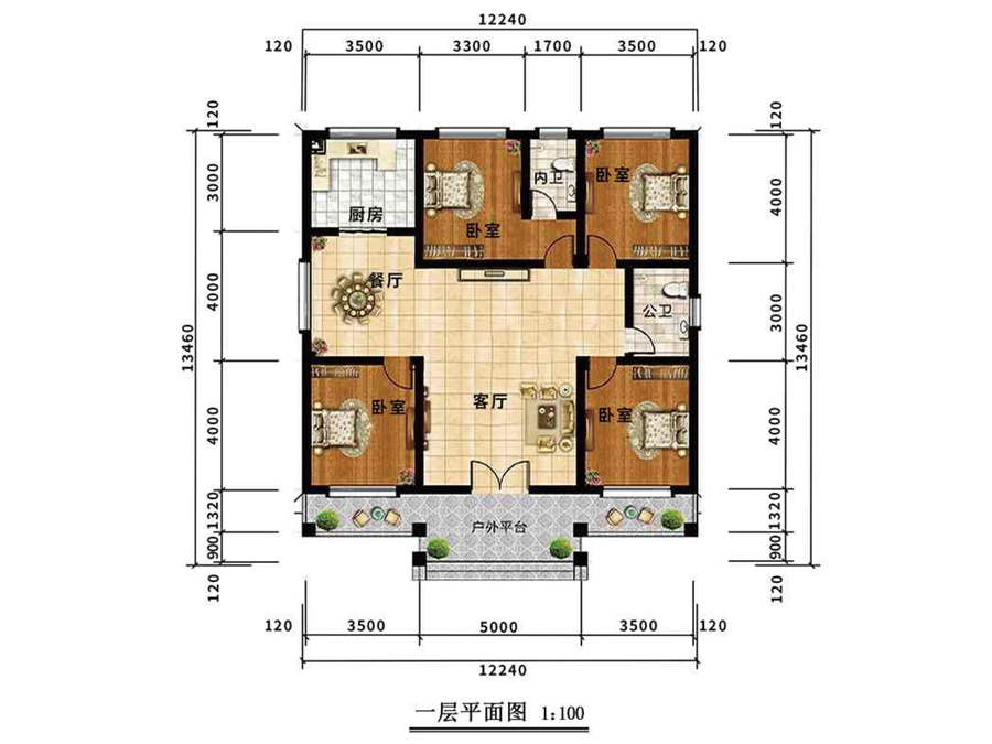 开间:12.24 m        进深:13.46 m        占地面积:165 m2         建筑面积:165 m2
